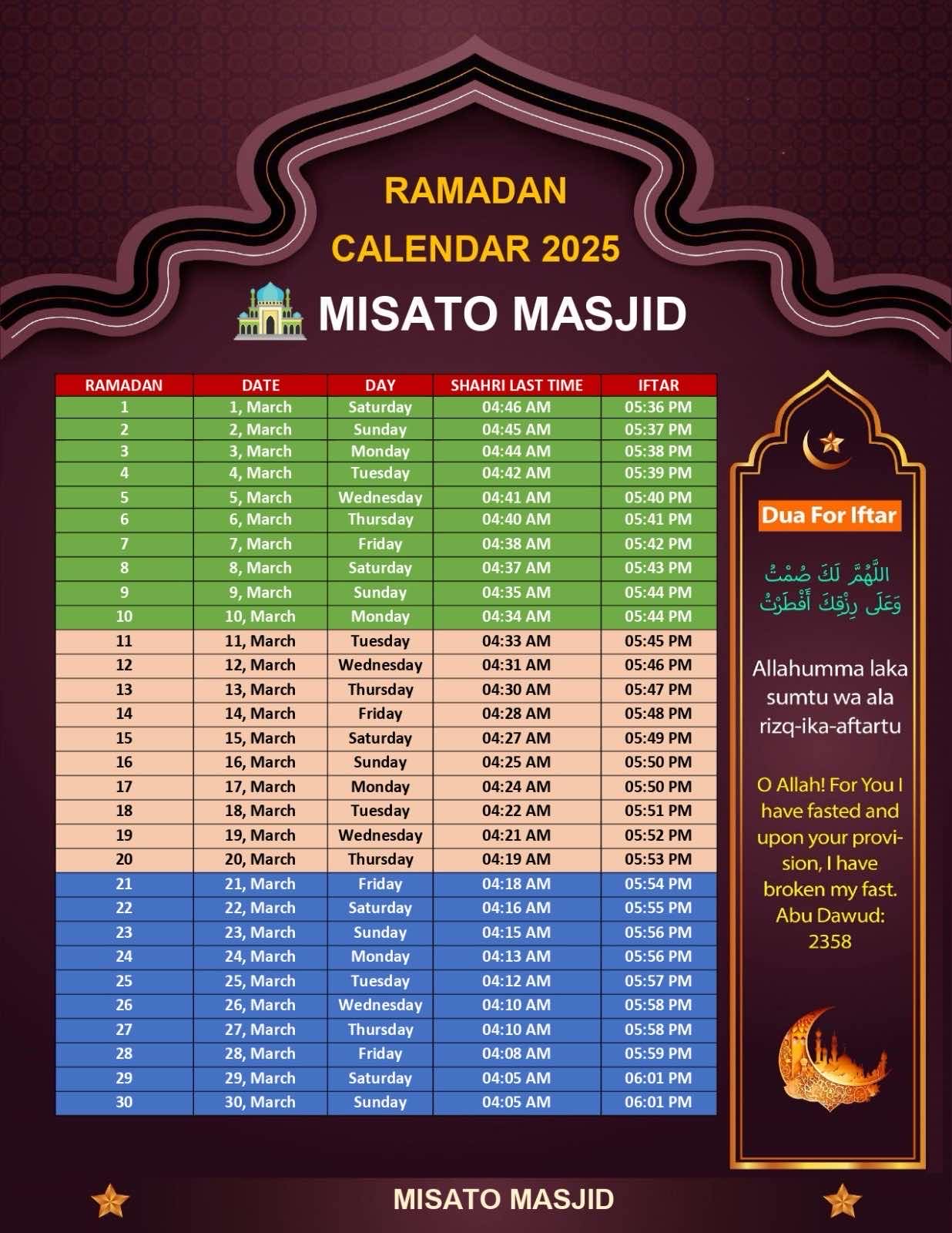 イード・アル=フィトル(断食明けの祝祭)は、2025年3月31日(月)に開催される予定です。ただし、30日に月が確認できない場合、4月1日(火)になる可能性もあります。 このたび、**Misato Masjid(美里モスク)**では、イード礼拝を2回実施いたします。 ※雨天時やグラウンド使用不可の場合は、第2回礼拝もモスク内で行います。 また、今年のフィトル(喜捨)は1人あたり2000円です。ご参加の礼拝までに、必ずお納めください。 Eid al-Fitr is expected to be celebrated on Monday, March 31, 2025. It might be on Tuesday, April 1, if the moon is not sighted on the 30th. We are happy to announce that there will be two Eid al-Fitr jam’ah at Misato Masjid. The first jam’ah will be at 7:00 […]