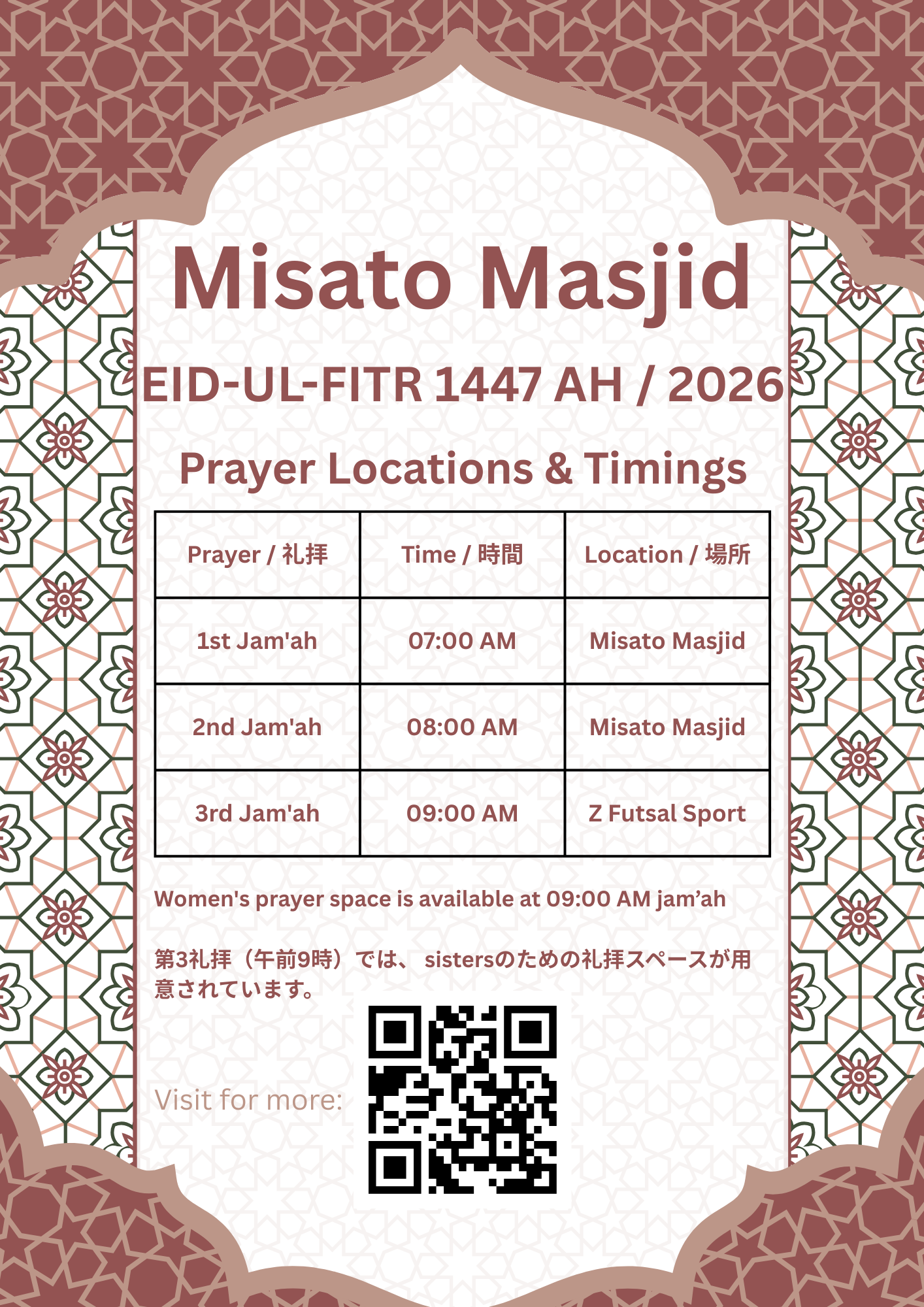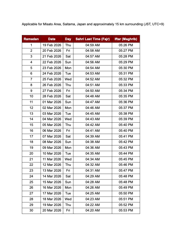 Eid-ul-Fitr 1447 AH / 2026مسجد ميساتوからのお知らせ 三郷マスジドより、フィトル礼拝のお知らせをいたします。 📍 Z Futsal Sport 新三郷 所在地:〒341-0011 埼玉県三郷市采女1丁目121 → Googleマップで開く ※ 第三礼拝 (午前9時) では、女性専用の礼拝スペースがございます。 【駐車場と安全についてのお願い】専用駐車場をご利用ください。道路や近隣施設への違法駐車は絶対におやめください。安全確保のため、路上での待機・滞留はご遠慮いただき、係員の指示に従って円滑な移動にご協力お願いいたします。 Announcement from Misato Masjid regarding Eid-ul-Fitr prayers. 📍 Z Futsal Sport Shin-Misato Address:1 Chome-121 Uneme, Misato, Saitama 341-0011, Japan → Open in Google Maps Note: A designated prayer area for women will be available […]