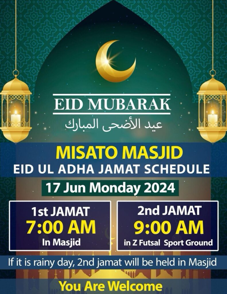 Eid ul-Adha prayers have been scheduled for Monday, June 17th, 2024. The first prayer will be held at 7:00 AM in the mosque. The second prayer will be at 9:00 AM at Z Futsal Sport Ground. If it is a rainy day, the second prayer will also be held in the mosque.